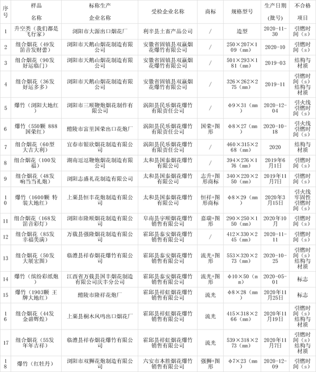 安徽省市場監管局:18批次煙花爆竹產品抽查不合格
