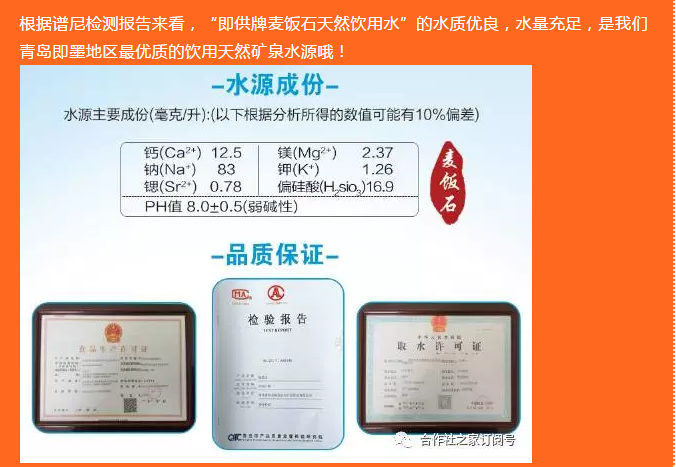 “即供牌”麥飯石天然飲用水由即墨市供銷社出品,即墨市青升日用雜品有限公司總經銷。