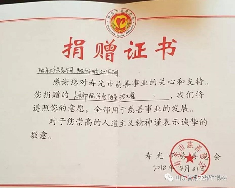 壽光市永順煙花爆竹有限公司向?yàn)?zāi)區(qū)捐款