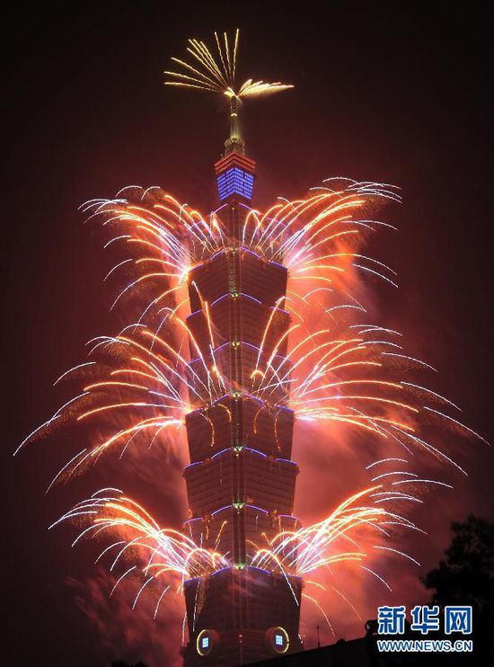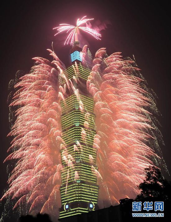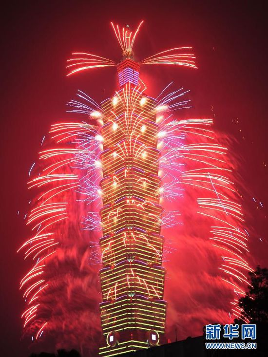 2015年1月1日零時,臺北101大樓舉行跨年煙火秀。本次跨年煙火秀時長為218秒,發(fā)數(shù)為23000發(fā),煙火施放高度達600米。美麗璀璨的煙火照亮臺北夜空,迎接2015年的到來。新華社發(fā)(吳景騰 攝)