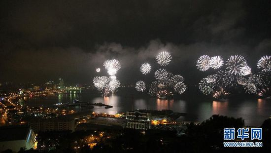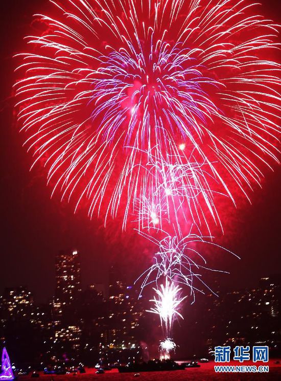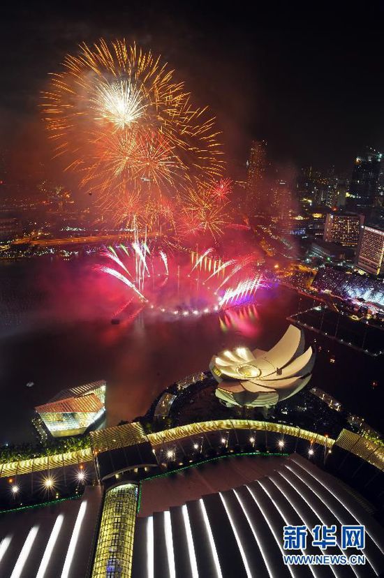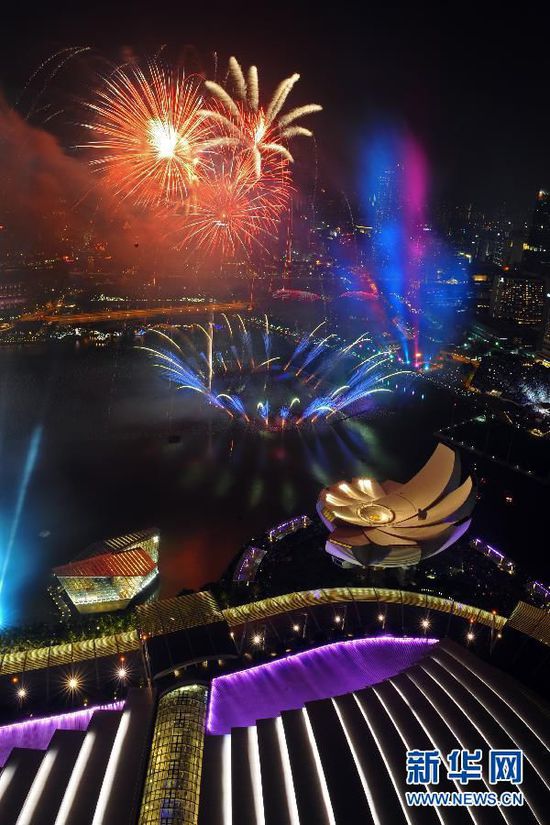 1月1日,璀璨煙火燃放在新加坡濱海灣上空。當(dāng)日,新加坡在濱海灣舉行跨年倒數(shù)派對,并預(yù)先慶祝國家獨立50周年。 新華社發(fā)(鄧智煒攝)