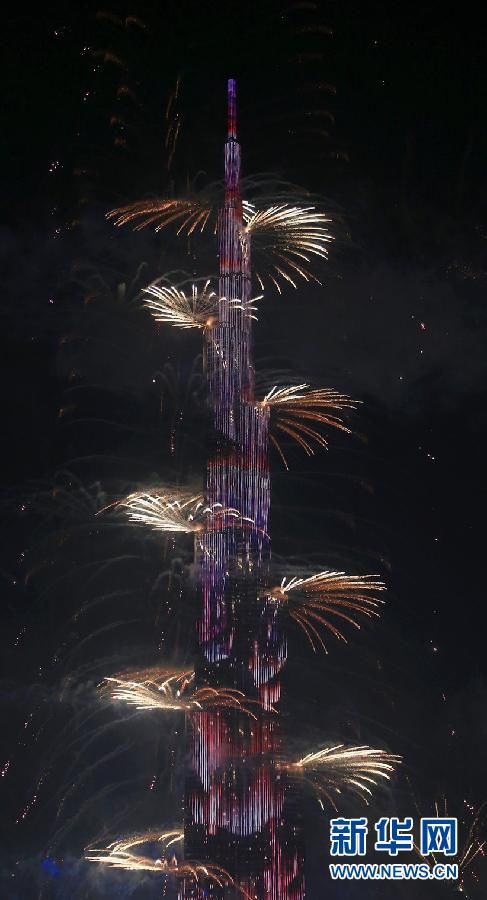 1月1日,世界最高建筑——迪拜哈利法塔燃放焰火慶祝新年。當(dāng)日,阿聯(lián)酋迪拜的哈利法塔、帆船酒店等地舉行大型焰火表演,吸引數(shù)十萬市民與游客共迎新年。 新華社發(fā)(李超攝)