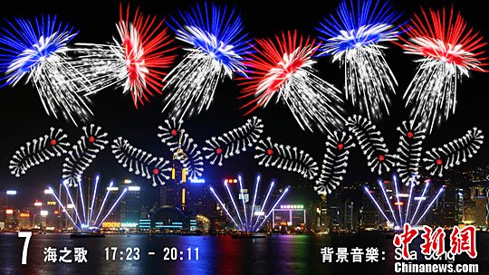 中新社香港9月19日電 (楊喆 林宇星)為慶祝中華人民共和國(guó)成立67周年,10月1日晚上9時(shí)在香港維多利亞海港上空將有歷時(shí)23分30秒的國(guó)慶煙花匯演。主辦方19日公布,今年的煙花設(shè)計(jì)包含“功夫”“海洋”等元素。