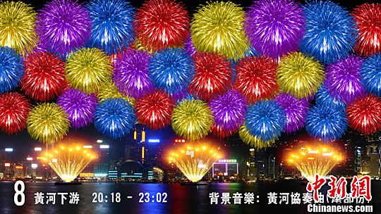 國(guó)慶煙花匯演將由3艘躉船發(fā)放23888枚煙花彈,在夜空中形成一個(gè)800米寬、300米高的煙花銀幕。匯演共有8幕,分別為《黃河上游》、《獅子山下》、《春之圓舞曲》、《功夫》、《火之舞》、《我的驕傲》、《海之歌》和《黃河下游》。