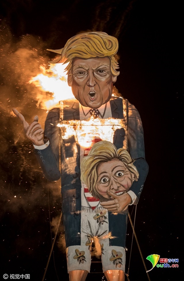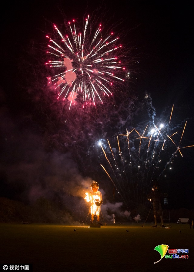 當(dāng)?shù)貢r(shí)間2016年11月5日,英國(guó)伊登布里奇年度篝火晚會(huì)舉行,焚燒美國(guó)共和黨總統(tǒng)候選人特朗普的巨型雕像。伊登布里奇篝火協(xié)會(huì)曾在歷年活動(dòng)上焚燒多位名人的雕像,今年特朗普被選作了該活動(dòng)的年度人物。圖片作者:視覺(jué)中國(guó)