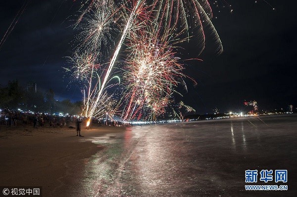 當?shù)貢r間2018年1月1日,印尼巴厘島,當?shù)厝挤艧熁☉c祝新年到來。