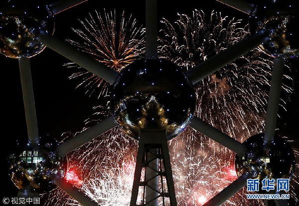 當?shù)貢r間2018年1月1日,比利時布魯塞爾,當?shù)厝挤艧熁☉c祝新年到來。