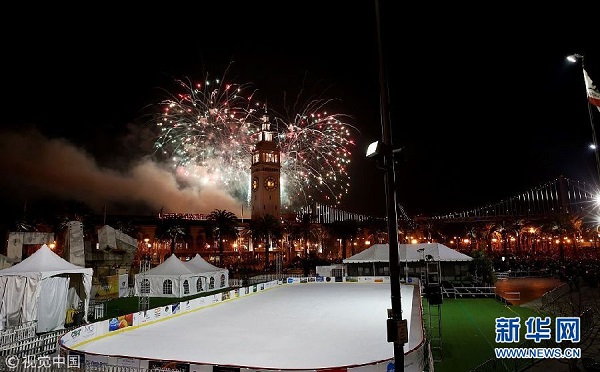 當?shù)貢r間2018年1月1日,美國舊金山,當?shù)厝挤艧熁☉c祝新年到來。