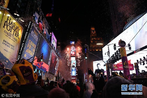 當?shù)貢r間2018年1月1日,美國紐約,紐約時報廣場燃放起焰火。當日,紐約時報廣場舉行一年一度的跨年慶典,人們在嚴寒中迎接新年。
