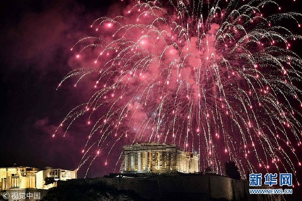 當?shù)貢r間2017年12月31日,希臘雅典,當?shù)厝挤艧熁☉c祝新年到來。